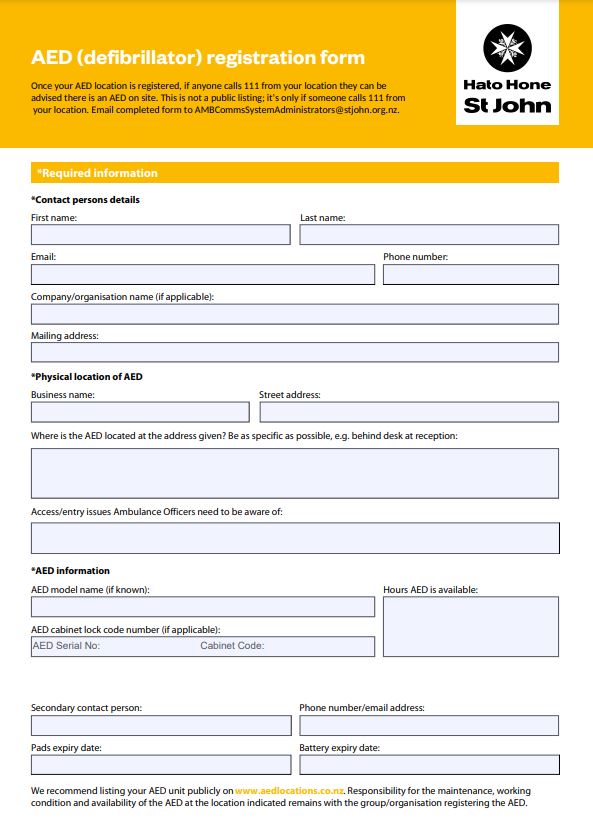 * By registering your AED with St John, you will also go on the national database and receive reminders when batteries need checking, pads replacing, etc.